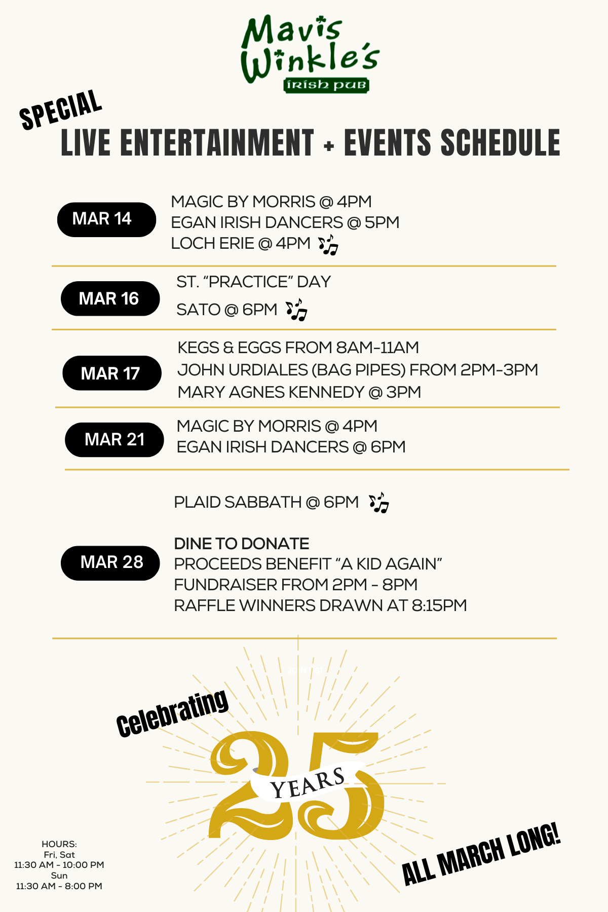 Celebrating 25 Years of Mavis! Shamrocks up, spirits high — let’s get our green on and chase the luck sky-high! 🍀✨ Kegs and Eggs Starting at 8am!